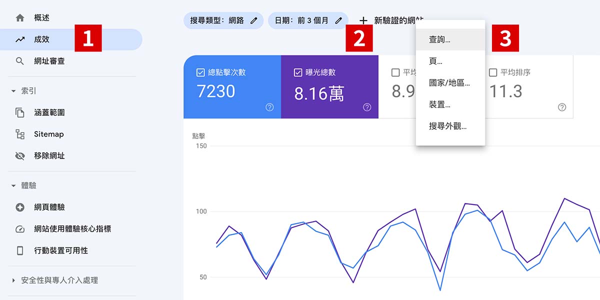 做了這麼多優化工作之後,最後我們當然會想知道體優化策略是否有成效呢?是否有被 Google 搜尋排序在前面呢?有沒有被我操作的關鍵字搜尋到呢?而評估成效時,我們最常關注的指標就是點擊、曝光、點閱率及排名。