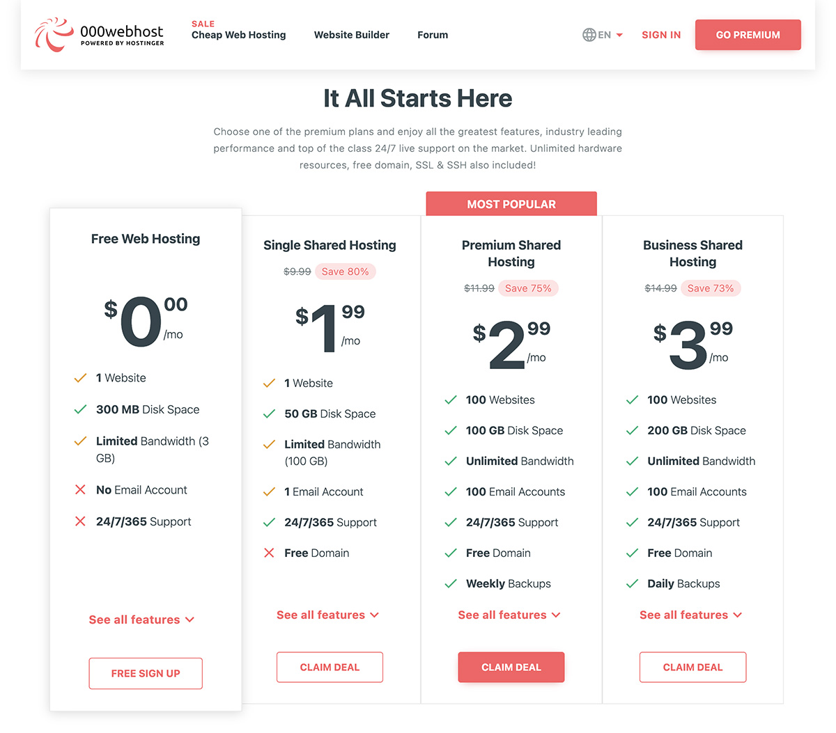 點擊 Free Web Hosting 方案下方的 FREE SIGN UP。