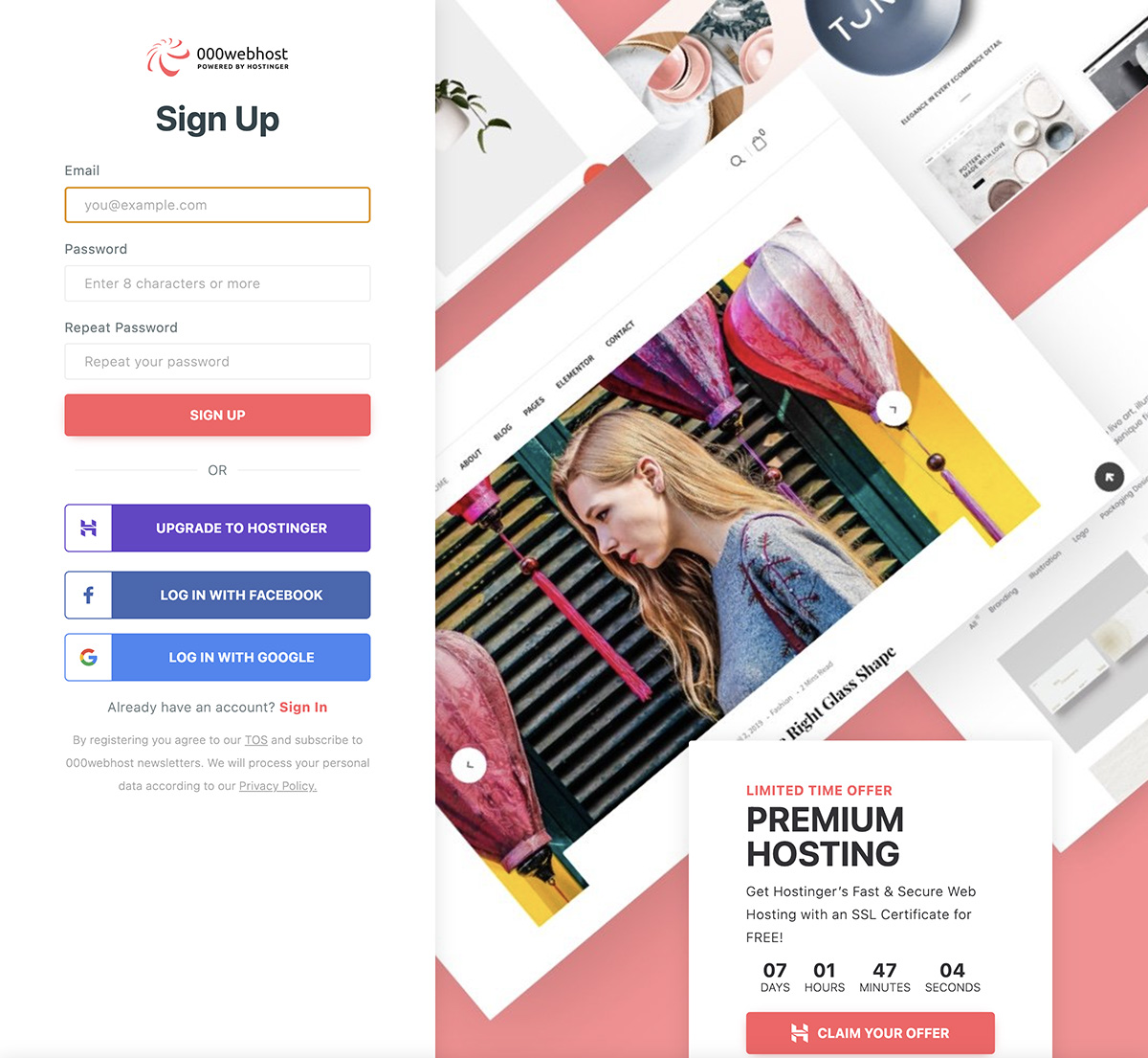 000webhost 提供多種註冊方式,我是使用 Google 帳號進行註冊,點擊 LOG IN WITH GOOGLE 按鈕。
