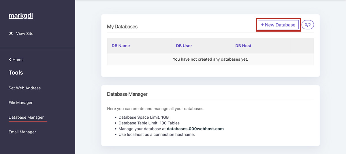 點選左邊選單中的 Tools > Database Manager,再點畫面中的 + New Database 按鈕,建立資料庫。