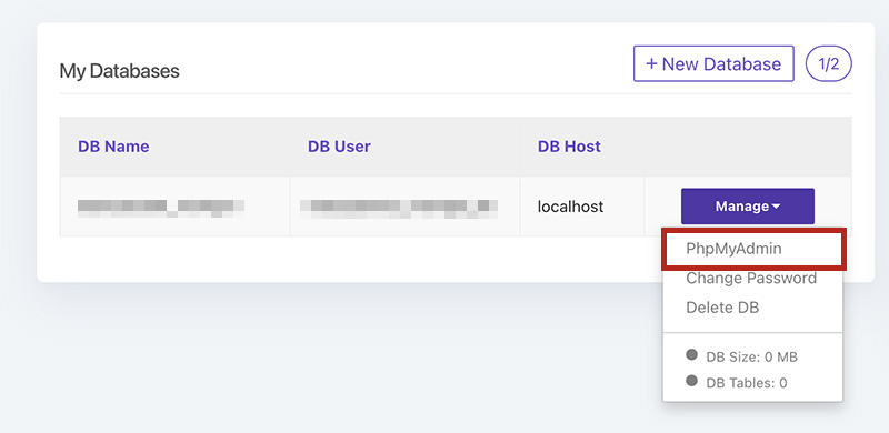 要管理資料庫內容,可以點選 Manage > PhpMyAdmin。