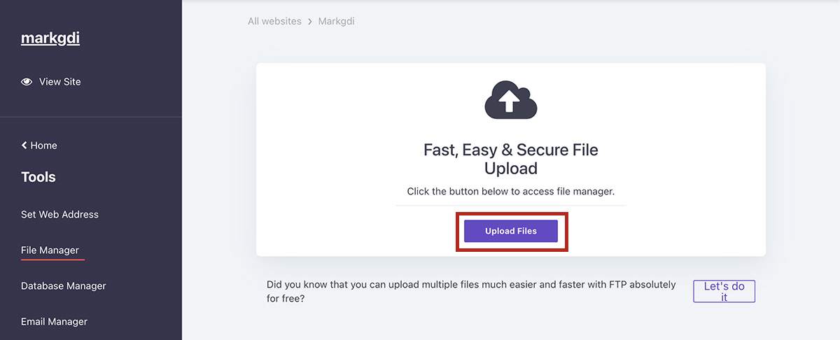 第一種方式是使用網頁檔案管理工具,直接點選左邊選單中的 Tools > File Manager,再點畫面中的 Upload Files 按鈕,就會開啟網頁檔案管理工具。