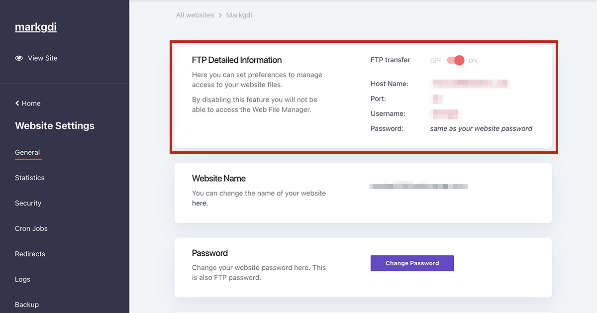第二種方式是使用 FTP 軟體進行檔案上傳,如 FileZilla。點選左邊選單中的 Website Settings > General,畫面中的 FTP Detailed Information 就是 FTP 連線資訊。