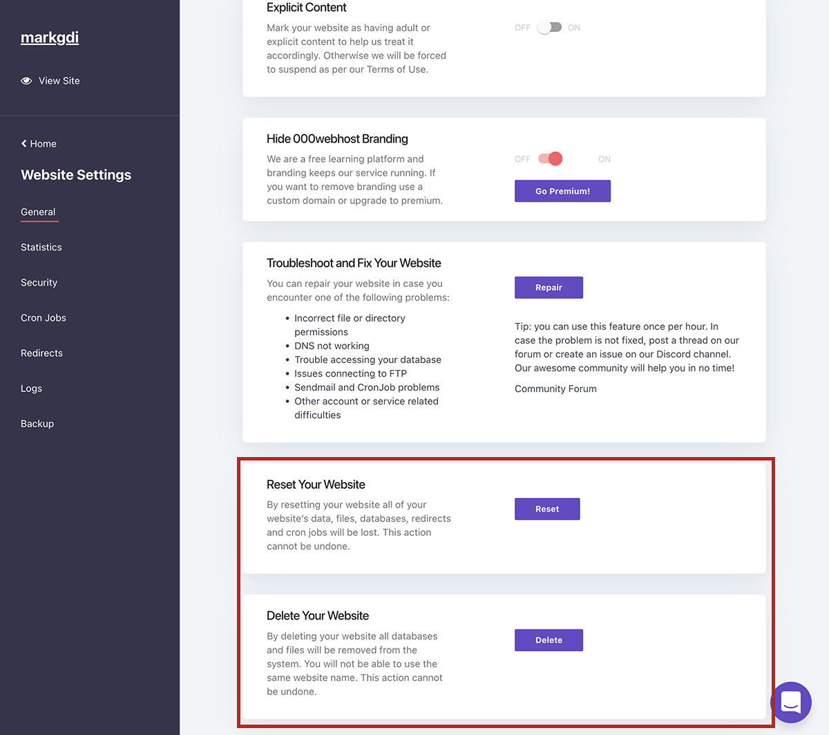 點選左邊選單中的 Website Settings > General,在畫面最下方找到 Reset Your Website 及 Delete Your Website。