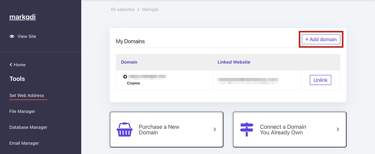 如果您有購買網址,可以先在 DNS 設定 CNAME 導向至 000webhost 中的網址。並點選左邊選單中的 Tools > Set Web Address,再點畫面中的 + Add domain 按鈕,選擇 Point domain 進行設定。